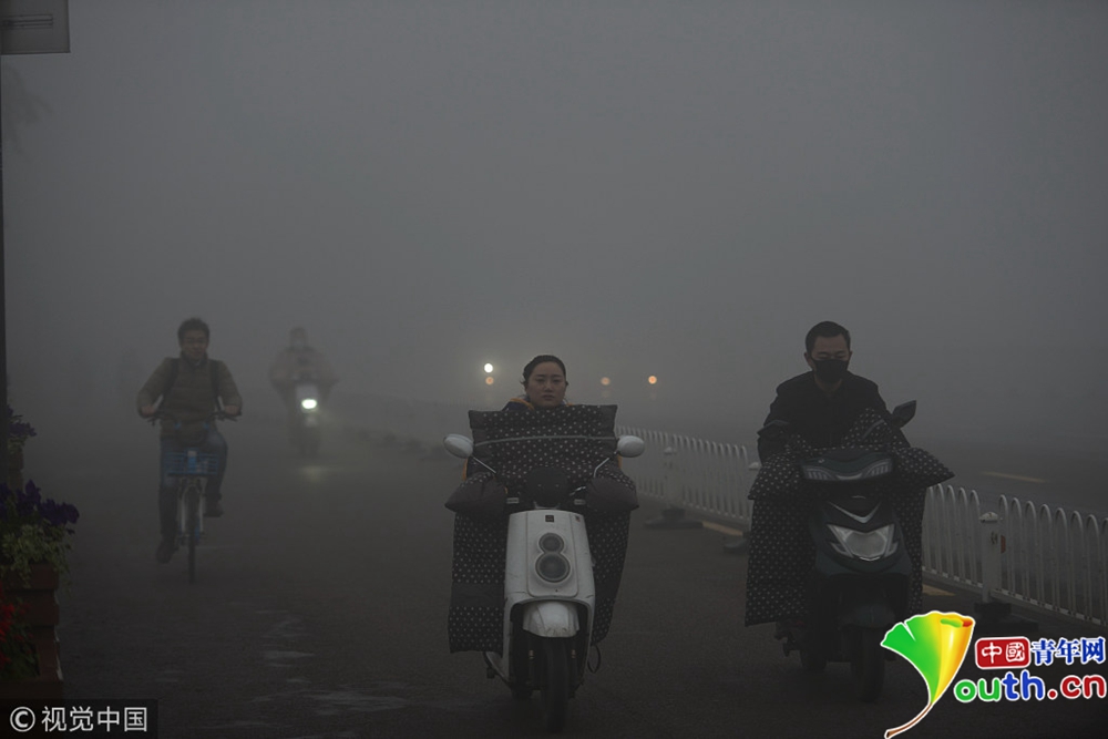 2018年11月26日,南京,市民在大霧彌漫的街頭出行。