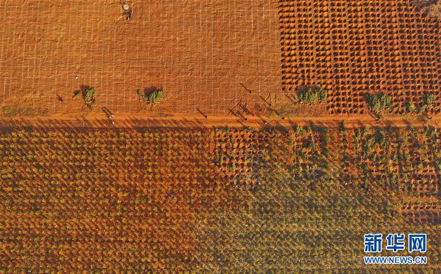 11月25日,遷安市蔡園鎮(zhèn)劉莊子村的村民在村北鐵礦廢料場(chǎng)栽植松樹(無人機(jī)拍攝)。
