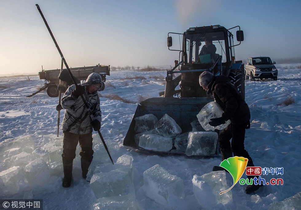 圖為村民將采集上來(lái)的冰塊裝車(chē)。