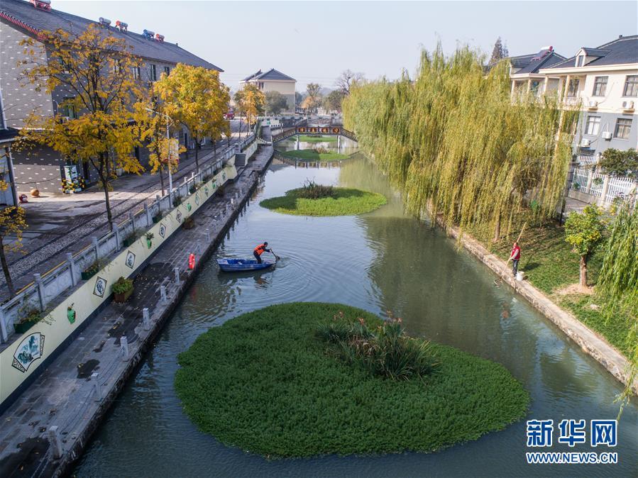 11月28日,長興縣虹星橋鎮(zhèn)港口村東港內(nèi),河長孫根法在打撈水面漂浮物(無人機拍攝)。東港全長1500米,環(huán)繞港口新村。2012年,新村建成后,港口村通過加固河岸、清理河道、種植浮草等方式對東港進行生態(tài)治理,并由該村黨總支書記孫根法擔(dān)任河長,定期開展巡查,引導(dǎo)村民自覺維護河道整潔。 新華社記者 徐昱 攝
