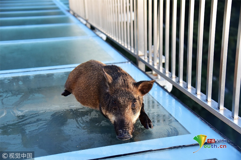 2018年11月29日早上7時多,古龍峽玻璃大峽谷出現(xiàn)了云海奇觀,云蒸霧繞,如同仙境。正在玻璃橋上值早班的保安發(fā)現(xiàn),玻璃橋上闖入一只動物,體型還比較大,由于霧氣大,不太清楚是什么動物。保安走前一看,竟然發(fā)現(xiàn)是1只山豬。