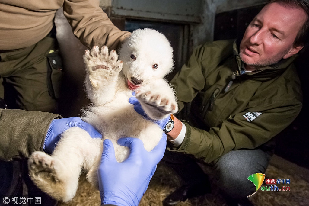 當地時間2017年1月12日,德國柏林,柏林蒂爾加滕動物園為一只雄性北極熊寶寶檢查身體。熊寶寶于2016年11月3日出生,身高67厘米,體重4.6千克。
