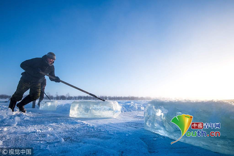 當(dāng)?shù)貢r(shí)間2018年11月27日,雅庫(kù)茨克,零下41攝氏度左右的氣溫下,村民在當(dāng)?shù)氐囊粋€(gè)湖中采集冰塊。當(dāng)?shù)睾芏嗳艘蕾囉谌诨鶋K解決供水,因?yàn)槎嗄陜鐾粮采w地區(qū)冬季氣溫極低,沒有其他的方式供應(yīng)水。