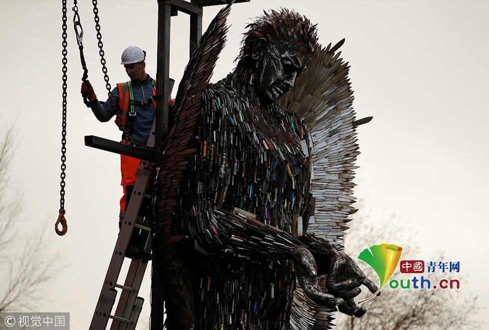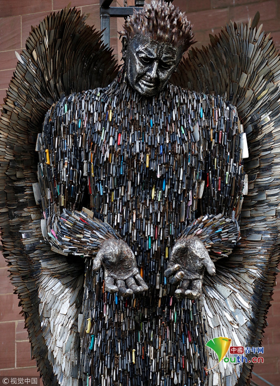 當(dāng)?shù)貢r(shí)間2018年11月29日,英國(guó)利物浦,藝術(shù)家阿爾菲·布拉德利在圣公會(huì)教堂外用沒(méi)收的10萬(wàn)多把刀具制作了一尊名為“刀之天使”的塑像。