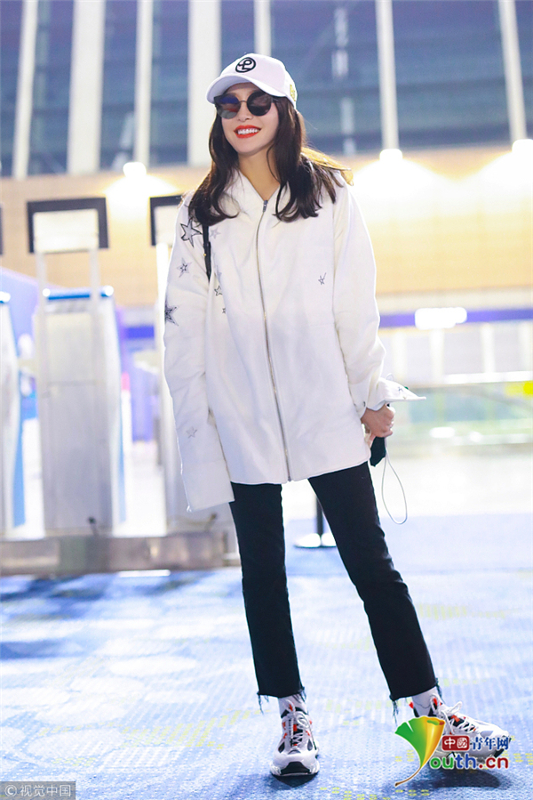 11月29日,上海,秦嵐現(xiàn)身機(jī)場。她戴白色鴨舌帽,穿白色星星圖案外套配微喇牛仔褲,架黑超涂紅唇笑靨如花。