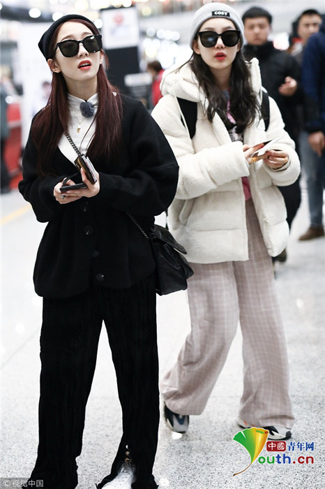 2018年12月3日,北京,“火箭少女101”全體成員現(xiàn)身機(jī)場(chǎng)前往國(guó)外錄制團(tuán)總綜。其中孟美岐戴著墨鏡,一身全黑運(yùn)動(dòng)裝扮,大步流星氣場(chǎng)超強(qiáng),楊蕓晴、yamy、楊超越等成員緊隨其后,大家還一起在機(jī)場(chǎng)玩起自拍,好不歡樂。