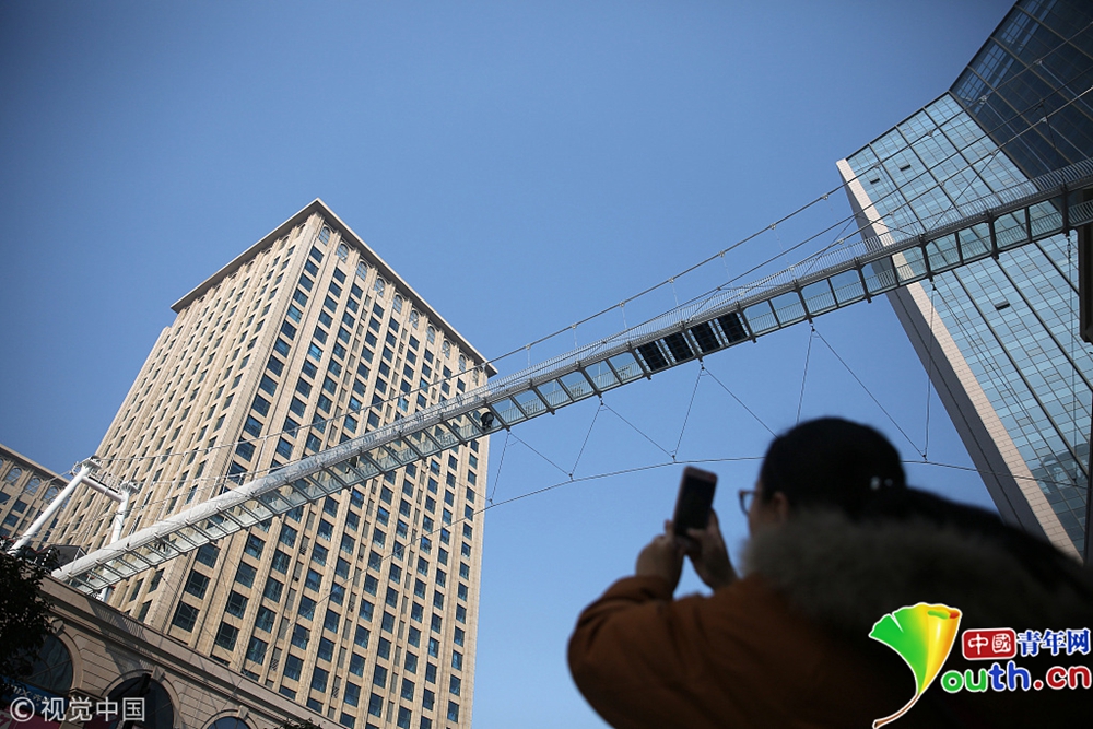 玻璃吊橋被三座高層寫(xiě)字樓所環(huán)繞,緊鄰石家莊火車站和南二環(huán)高架橋,車流、人流密集。