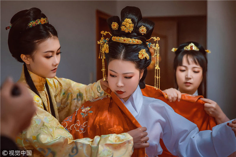 2018年11月18日,浙江嘉興。女孩黃聰今年30歲,是浙江省海寧市硤石人,是一位對(duì)漢文化情有獨(dú)鐘的個(gè)性女孩。對(duì)于這一次的漢婚大禮的每一個(gè)細(xì)節(jié),都非常仔細(xì)。小到發(fā)簪首飾,大到日常禮儀。說起為什么會(huì)舉辦這樣一場古風(fēng)婚禮,她說自己從2013年戀上漢服,就下了這個(gè)決定。