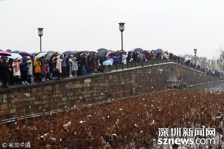 深圳新聞網(wǎng)訊 2018年12月8日,杭州,當(dāng)日市區(qū)普降大雪,市民和游客扎堆涌入西湖景區(qū),拍攝最美雪景照片以及為自己留影。每次杭州一下雪,斷橋便成為眾多游客欣賞雪景、拍攝雪景的地方,大家都想看看“斷橋殘雪”。游客們?cè)延咳霐鄻蚝?,人山人海,讓現(xiàn)場(chǎng)堪比春運(yùn)場(chǎng)景。因?yàn)槿颂?,雪積不起來,斷橋看不到殘雪。