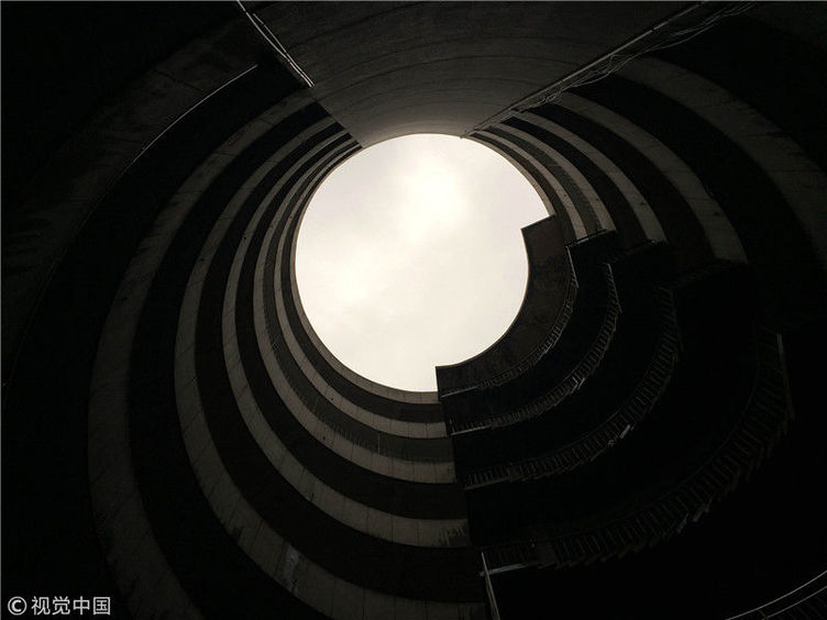 2018年12月6日,重慶江北紅旗河溝汽車站內,有一棟獨特的八層圓環(huán)狀建筑,底層每天有不少進出站的客車通行。據(jù)悉,這棟樓建于1990年,曾經是車站旅館,如今一、二兩層用于車站辦公,其余樓層已廢棄。為確保安全,三層以上已經被封鎖。圖為公交車穿過8層空心圓筒樓。徐勇/視覺中國