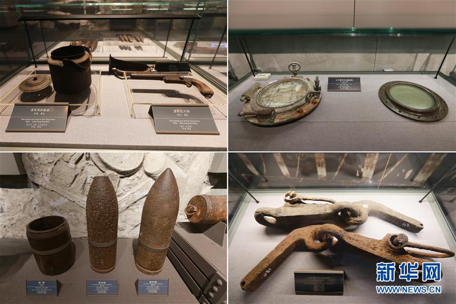 這是一張拼版照片,左上圖為:在甲午戰(zhàn)爭(zhēng)陳列館內(nèi)展出的清軍用的銅壺和信號(hào)槍;右上圖為:在甲午戰(zhàn)爭(zhēng)陳列館內(nèi)展出的北洋海軍濟(jì)遠(yuǎn)艦舷窗;左下圖為:在甲午戰(zhàn)爭(zhēng)陳列館內(nèi)展出的炮彈和穿甲彈;右下圖為:在甲午戰(zhàn)爭(zhēng)陳列館內(nèi)展出的北洋海軍艦用拋錨鉤(12月8日攝)。 新華社記者王南攝