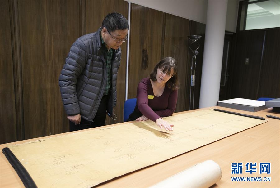 11月2日,在英國紐卡斯爾的泰恩—威爾檔案館,檔案管理員瑞秋·吉爾(右)向新華社記者介紹致遠艦設計圖紙。 新華社記者 韓巖 攝