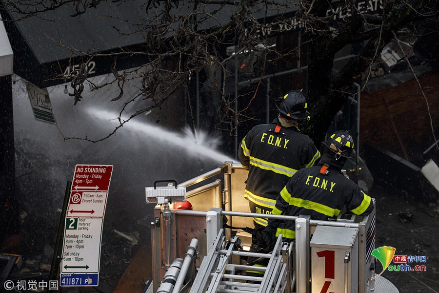 美國紐約,在紐約皇后區(qū)皇后大道,一場大火吞噬了六家商鋪,消防隊員正在努力撲滅火災(zāi)余燼。十幾人受傷,包括6名消防員。圖片作者:Drew Angerer