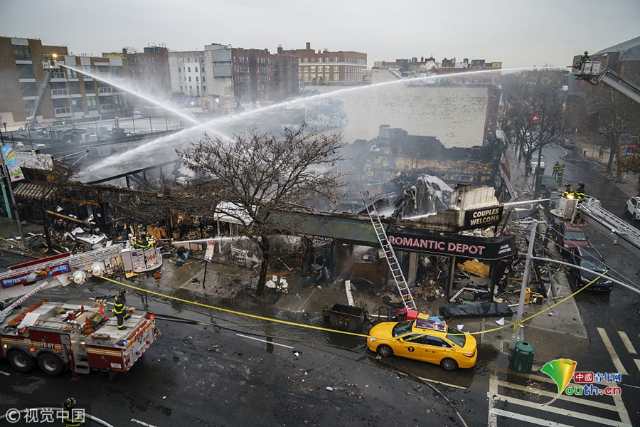 當(dāng)?shù)貢r間2018年12月13日,美國紐約,在紐約皇后區(qū)皇后大道,一場大火吞噬了六家商鋪,消防隊員正在努力撲滅火災(zāi)余燼。十幾人受傷,包括6名消防員。起火原因仍在調(diào)查中。圖片作者:Drew Angerer