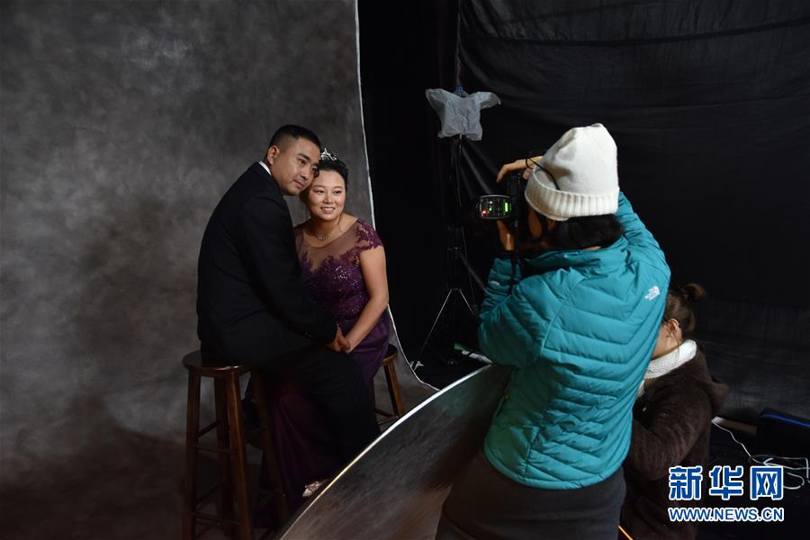 攝影師羅嫻為農(nóng)民工夫妻拍攝婚紗照(12月10日攝)。 新華社記者 白田田 攝