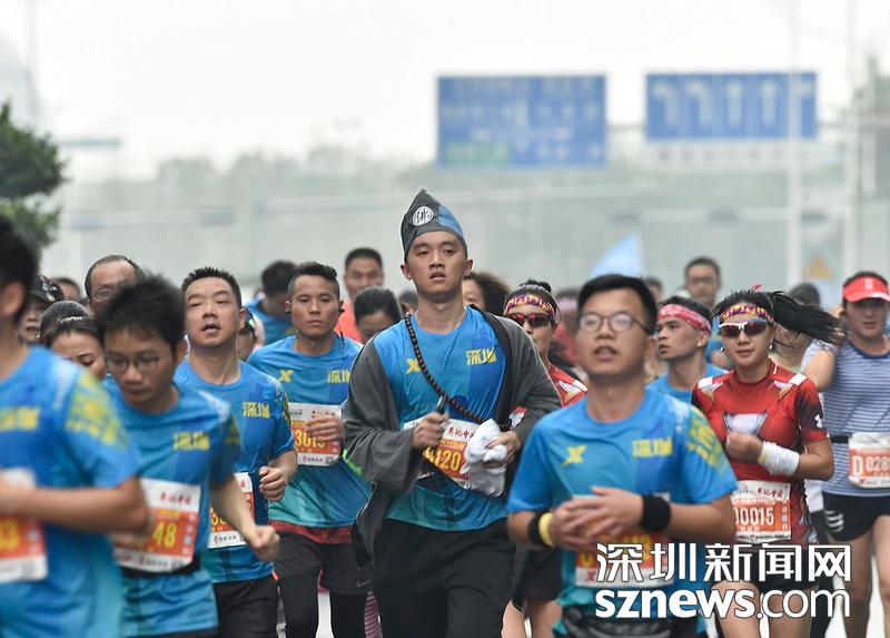 2018年12月16日,深圳國際馬拉松位于后海的折返點,一名穿著濟公服裝的選手正在向終點沖刺。