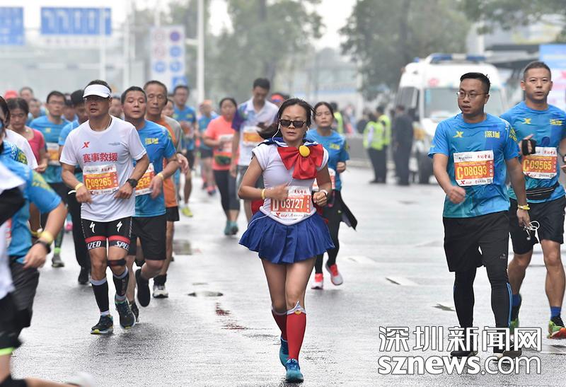 2018年12月16日,深圳國際馬拉松位于后海的折返點,一名選手正在向終點沖刺。