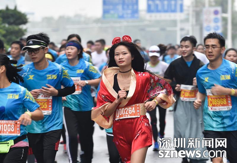 2018年12月16日,深圳國(guó)際馬拉松位于后海的折返點(diǎn),一名選手正在向終點(diǎn)沖刺,跟其他選手不同,本屆比賽有很多參賽者選擇自己穿著特色服裝參賽。