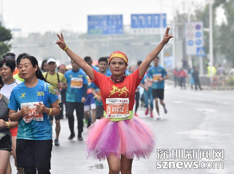 2018年12月16日,深圳國(guó)際馬拉松位于后海的折返點(diǎn),即將抵達(dá)終點(diǎn),一名選手?jǐn)[出勝利姿勢(shì)。