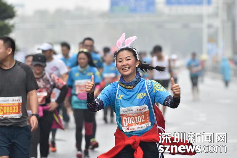 2018年12月16日,深圳國際馬拉松位于后海的折返點,即將抵達(dá)終點,選手對著鏡頭豎起大拇指。