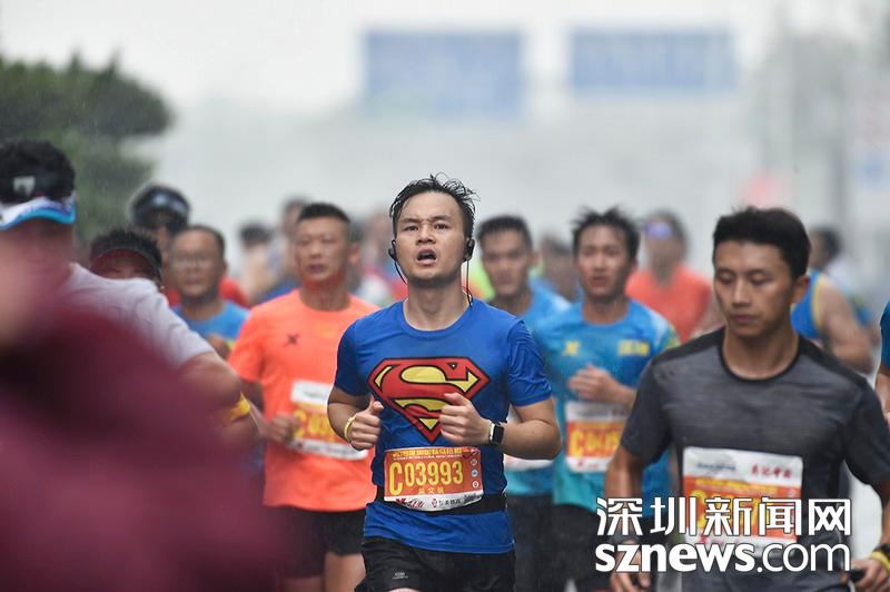 2018年12月16日,深圳國際馬拉松位于后海的折返點,一名身著超人標志短袖選手正在向終點沖刺。