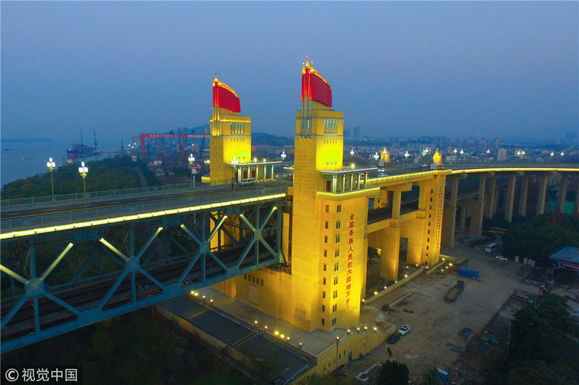 2016年10月28日晚,服役48年的南京長江大橋正式封閉,進入合同工期長達27個月的改造提升期。身為我國橋梁建設(shè)領(lǐng)域的扛鼎之作,南京長江大橋的此次封閉改造牽涉到公路繁忙、鐵路風(fēng)險、技術(shù)攻關(guān)、文物保護等諸多難點,不僅影響面廣,而且社會關(guān)注度極高。如今,隨著整個工程進入收尾階段,即將于2018年12月底正式通車。圖為2018年12月13日,夜幕降臨,南京長江大橋歸位后的玉蘭花燈重新點亮。大橋玉蘭花燈柱共有299根,每根燈柱上有5盞玉蘭花燈,1大4小,一共1495盞。