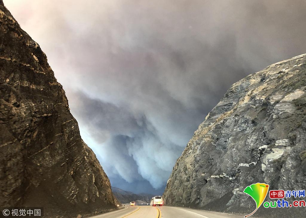 該郡第二大城市千橡樹市(Thousand Oaks)等很多地方房屋被毀,高速公路封閉,居民緊急疏散。洛杉磯郡圣蓋博市(San Gabriel)警察局警官日瓦戈(O. Zhivaga)和同事們當(dāng)天清晨即受命馳援文圖拉郡,保護當(dāng)?shù)鼐用窈拓敭a(chǎn)安全。圖為消防車行駛在已封閉的公路上,天空中濃煙滾滾。