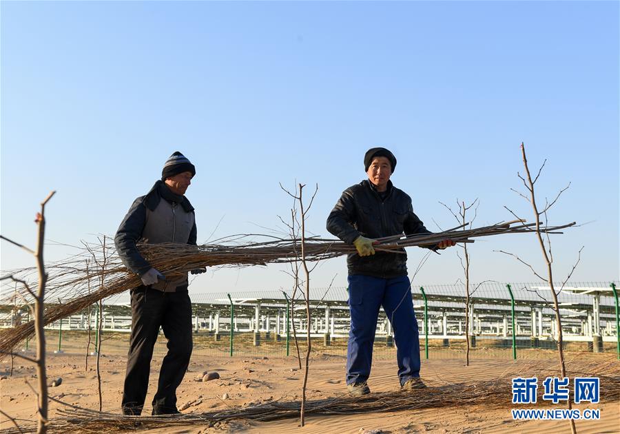12月13日,位于庫布其沙漠腹地的達(dá)拉特光伏發(fā)電應(yīng)用領(lǐng)跑基地一期500兆瓦項(xiàng)目中,工人用柳枝制作固沙帶。 新華社記者 彭源攝