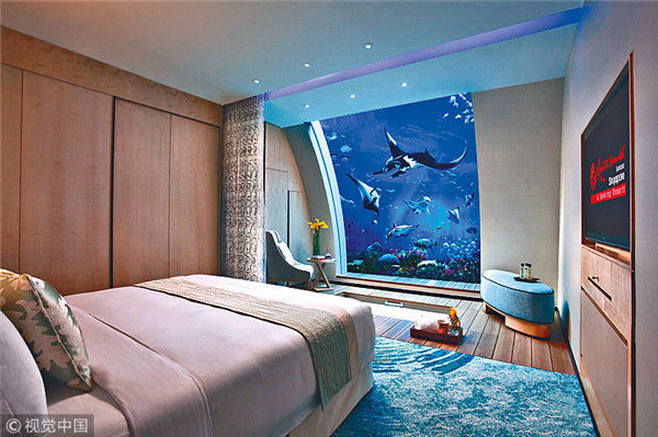 新加坡,圣淘沙名勝世界(Resorts World Sentosa),感受“上天下海”的住宿滋味。海洋館的深海奧秘生態(tài)區(qū)相連的特色套房。