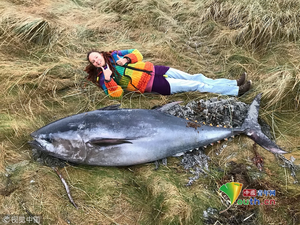 比人還大!狂風暴雨后2米長巨型藍鰭金槍魚擱淺沙灘