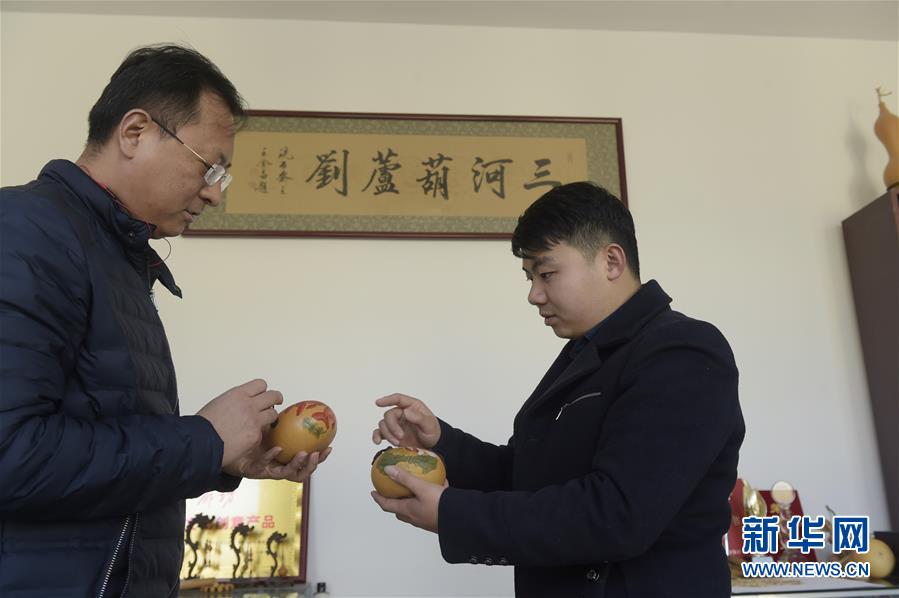 12月18日,劉征(右)在自己的加工坊里向來(lái)訪者介紹自己的葫蘆衍生品。 新華社記者 魯鵬 攝