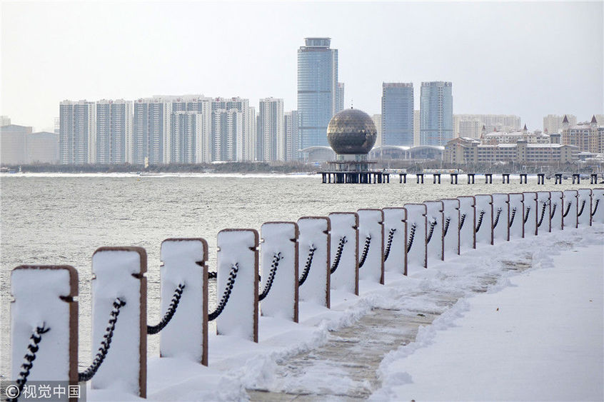2018年12月7日,山東煙臺,雪后的海濱景色。當日煙臺迎來今冬首場降雪,海濱建筑在大雪的裝點下,形成海濱城市獨有的美麗雪景。地處膠東半島的煙臺,冬季降雪量遠高于地理位置相近的其他地區(qū),形成了獨特的海濱雪城,是中國著名的“雪窩”。唐克/視覺中國