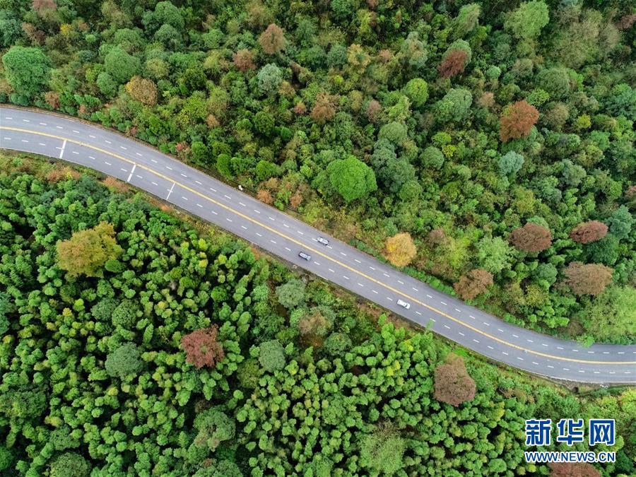 2018年11月21日,車輛行駛在國家第一條四車道盤山公路泰井高速上。 大地之色,俯仰之間;壯美山河,是我的祖國。2018年,新華社記者操縱無人機“飛閱”華夏大地,在最美的時節(jié),定格下她的色彩斑斕。 新華社記者 胡晨歡 攝
