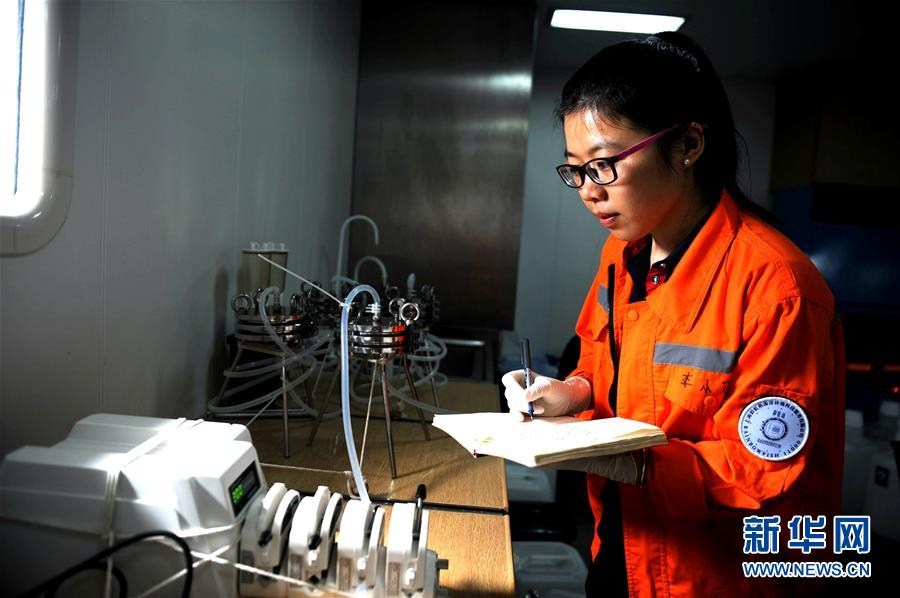 12月18日,來自中國(guó)科學(xué)院海洋研究所的博士后李小花在“沈括”號(hào)實(shí)驗(yàn)室工作。新華社記者 張建松 攝