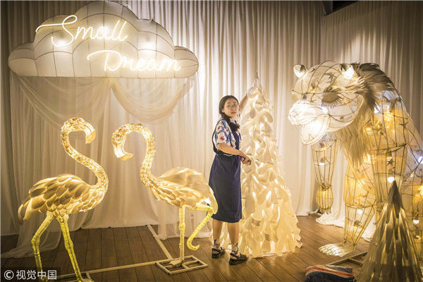 2018年5月6日,廣州,在天河區(qū)一家大商場辦個(gè)展時(shí),用紙片做成的北極熊、大松樹、火烈鳥、紙房子在光線的配合下美輪美奐,吸引了很多顧客駐足?!皫缀趺總€(gè)人一看到,都會(huì)走進(jìn)那個(gè)夢(mèng)幻的場景里,和這些紙雕一起合影?!眻D片攝于2018年5月6日。南塘/視覺中國