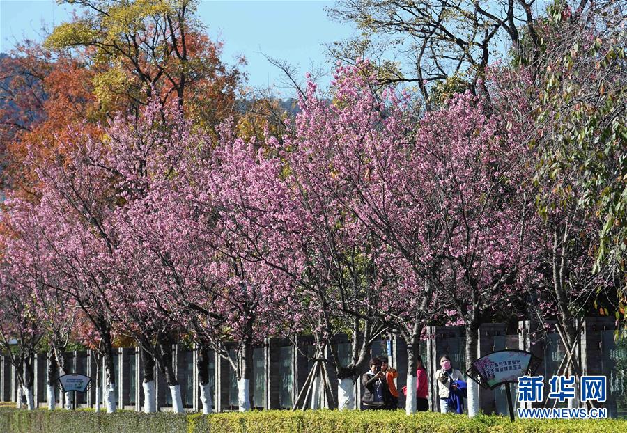 12月21日,游客在昆明市西山區(qū)一人行道上觀賞盛開的櫻花。新華社記者楊宗友攝