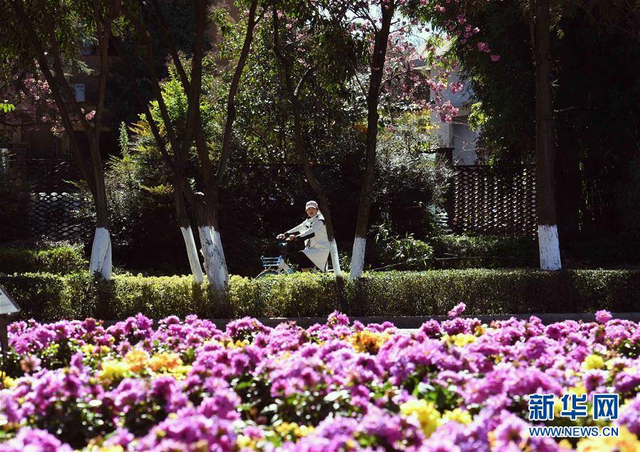12月21日,一名女士騎車經(jīng)過昆明市西山區(qū)鮮花盛開的路上。新華社記者楊宗友攝
