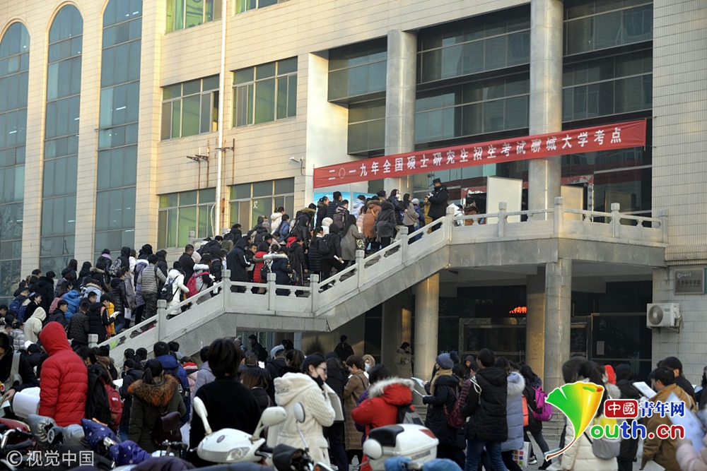 2018年12月22日,山東聊城,2019全國(guó)碩士研究生招生考試聊城大學(xué)考點(diǎn),考生們?cè)陉懤m(xù)進(jìn)入考點(diǎn)。
