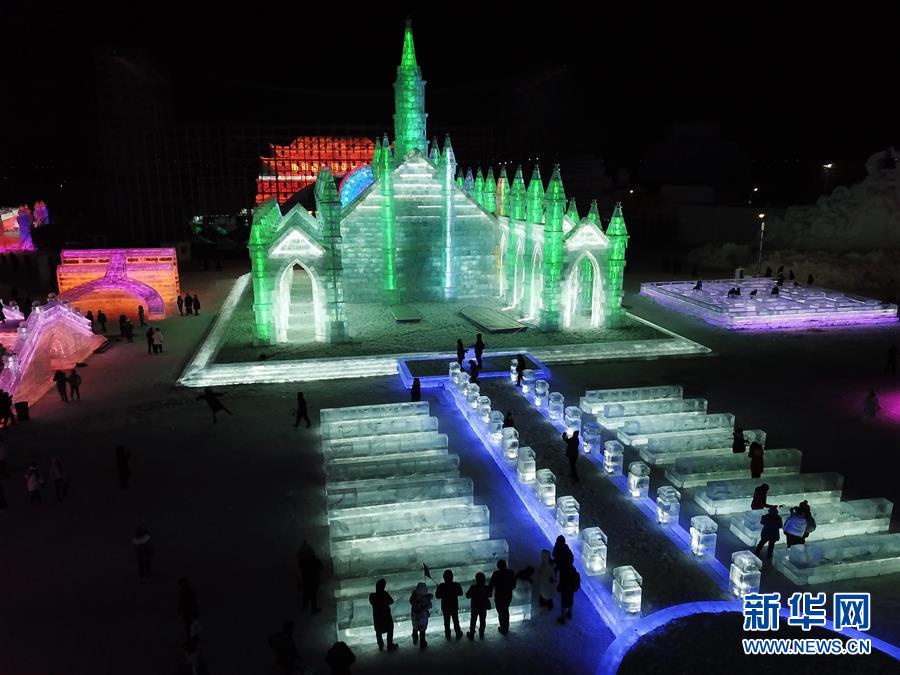 這是哈爾濱冰雪大世界園區(qū)內(nèi)的一處景觀(12月23日無人機(jī)拍攝)。