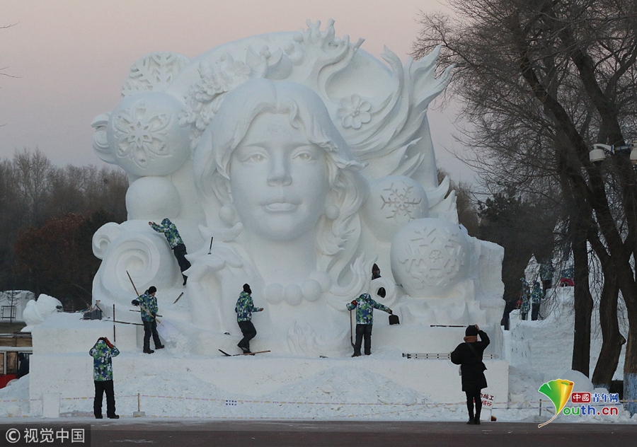 探秘哈爾濱太陽島雪博會:雪雕師精雕細(xì)刻建造忙