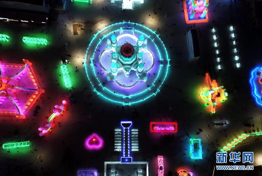 這是哈爾濱冰雪大世界園區(qū)內的一處景觀(12月23日無人機拍攝)。