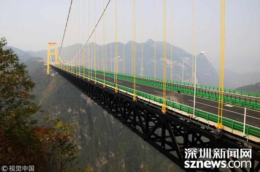 【世界第一高懸索橋——四渡河大橋】四渡河特大橋位于巴東縣野三關(guān)鎮(zhèn)四渡河,大橋主跨900米,橋面與峽谷谷底高差達(dá)560米,相當(dāng)于200層樓高,是目前國內(nèi)在深山峽谷里修建的最大跨度懸索橋,比目前世界最高橋法國米約大橋還要高290米,被譽(yù)為世界第一高懸索橋。