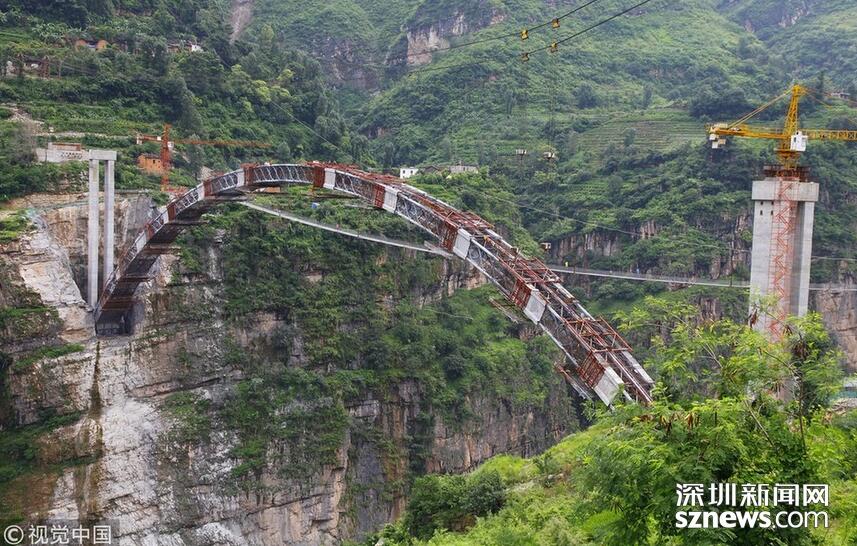 2018年5月30日,云南昭通,鸚哥大橋完成最后一段35米引橋現(xiàn)澆箱梁作業(yè),標(biāo)志著“鸚哥溜索改橋”主體工程完工,進入最后階段的橋面鋪裝和防護欄施工,預(yù)計6月底建成通車。