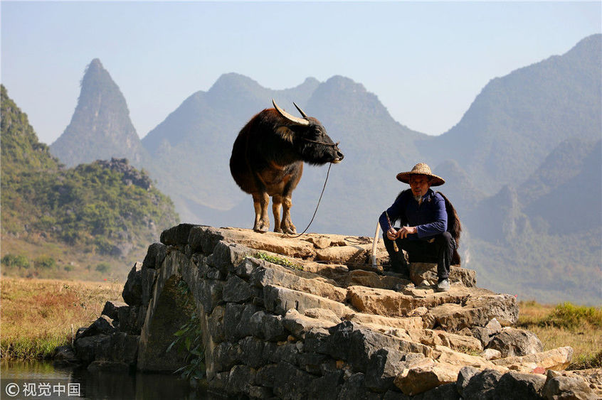 2018年12月17日,廣西桂林。用不到3年時間,農民許修保愣是將自己家的水牛訓練得走上了貓步,這讓來自全國各地的游客嘖嘖稱奇:你這么牛,維密天使情何以堪?憑著與水牛的聯(lián)袂演出,一個月下來,老許會有兩三萬的收入進賬,佩服得左鄰右舍紛紛向他伸出了大拇指。棋簿紫/視覺中國