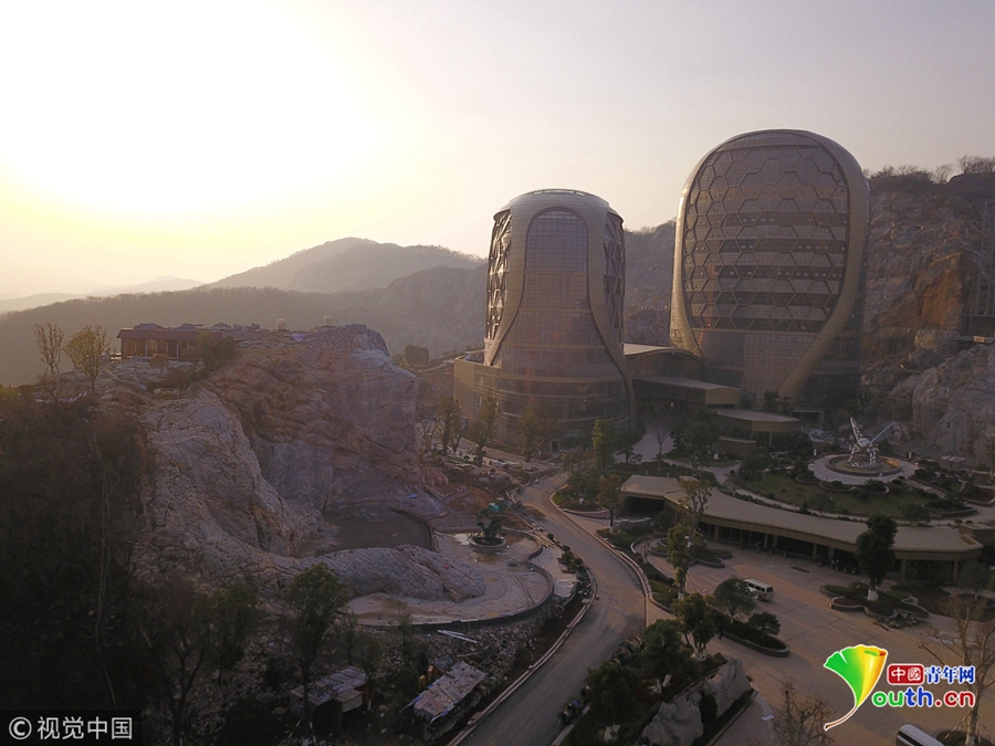 2018年12月23日,南京浦口區(qū)老山風(fēng)景區(qū)三河采石場宕口,利用宕口廢棄工地進行生態(tài)修復(fù)的蜂巢酒店主體完工。經(jīng)過100名雕刻工人近半年的施工,酒店兩側(cè)被破壞的山體變成兩只高30多米的巨型山體雕塑石獅,栩栩如生,場面極其震撼。