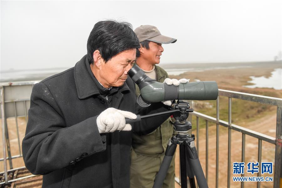 12月22日,王三益(前)在菜子湖濕地觀測(cè)候鳥。 新華社記者 張端 攝