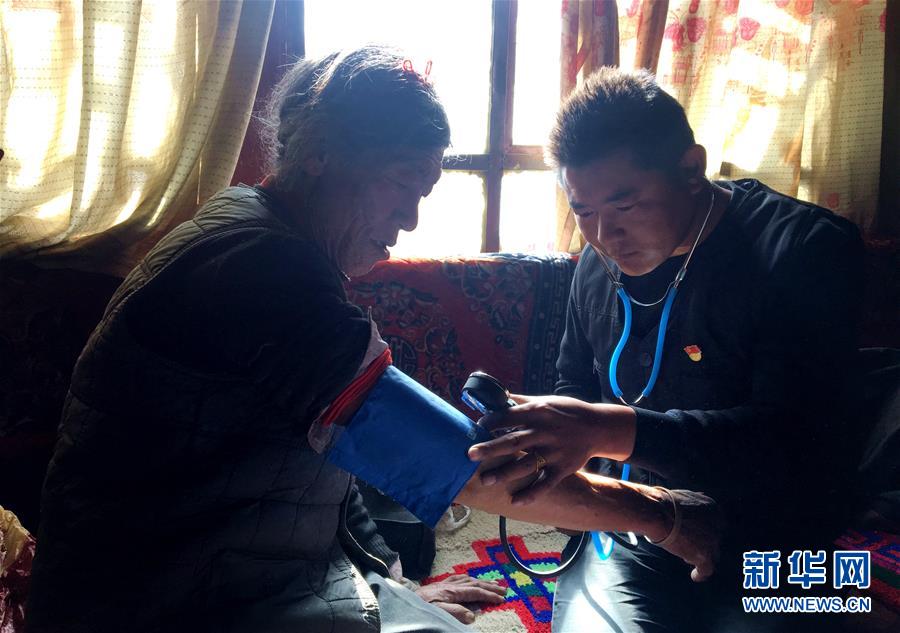 楚魯松杰鄉(xiāng)衛(wèi)生院院長(zhǎng)次仁頓珠(右)在給楚魯松杰鄉(xiāng)巴卡村卡熱組阿孜冬季牧場(chǎng)的牧民索朗多吉測(cè)量血壓(12月22日攝)。 新華社記者 陳尚才 攝