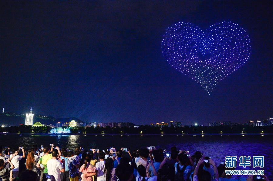 8月16日,無人機(jī)在湖南長沙橘子洲頭擺出愛心圖案。 在即將過去的2018年,各地?cái)z影師用鏡頭記錄下四季中國。大江南北,一幅幅色彩斑斕的美麗畫卷徐徐展開。 新華社記者 張笑宇 攝