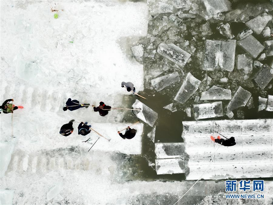 在松花江哈爾濱段江面,工人們?cè)谶M(jìn)行切割和采冰工作(12月12日無(wú)人機(jī)拍攝)。 黑龍江哈爾濱市的冰雪主題樂(lè)園哈爾濱冰雪大世界的采冰和建設(shè)工作近日拉開(kāi)帷幕。為保證足夠的優(yōu)質(zhì)冰供給,每天有近千名采冰人和700多輛運(yùn)冰車(chē)參與到采冰工作。 新華社記者 王松 攝