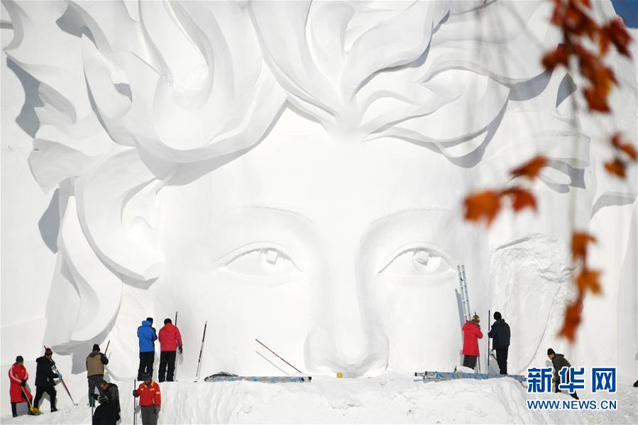12月24日,雪雕師在制作太陽島雪博會主塑“星河之旅”。 當日,哈爾濱太陽島雪博會主塑露出“芳容”。本屆雪博會主塑“星河之旅”長106米,高32米,寬20米,用雪量達4萬立方米。 新華社記者 王建威 攝
